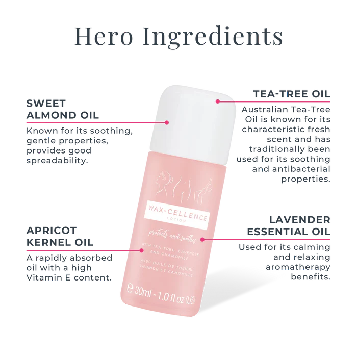 Also use Wax-cellence Lotion after hot or strip waxing to soothe and moisturise the skin.